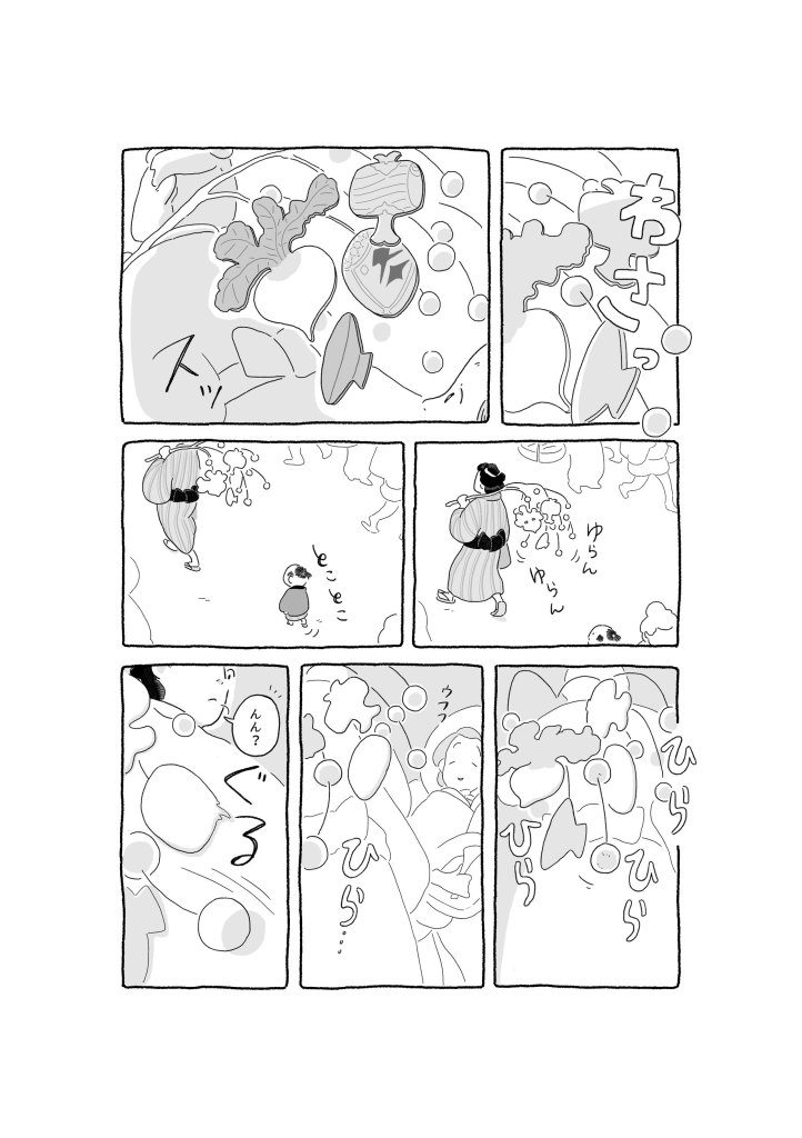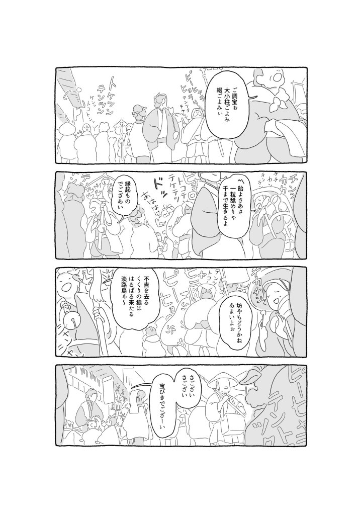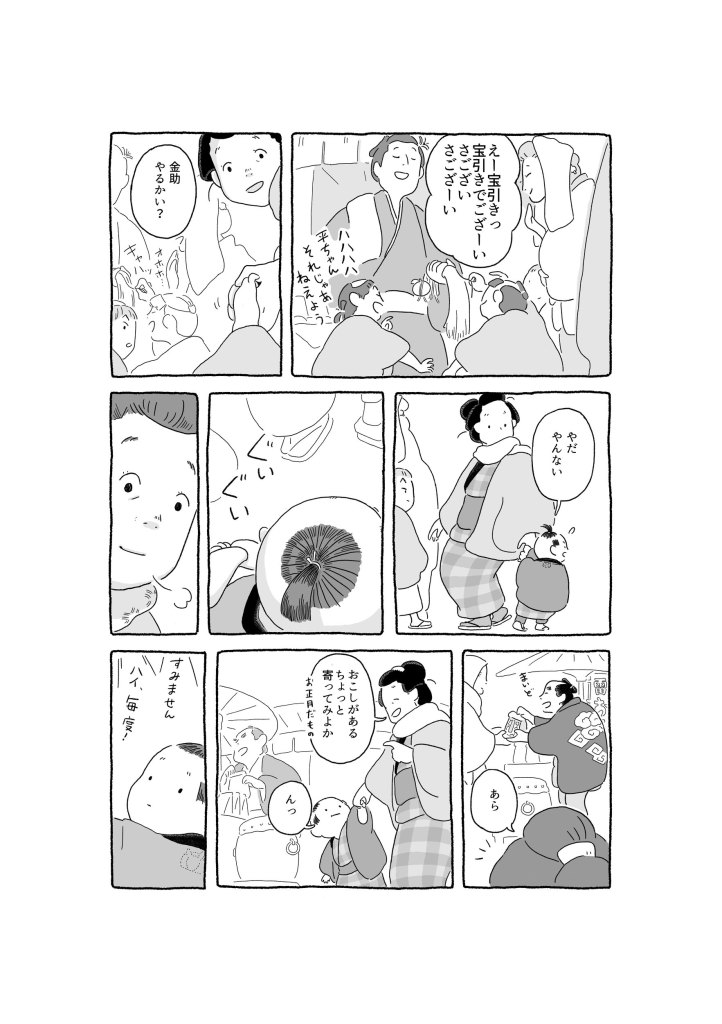 連載中のエピソードから抜粋した、年初めの様子を描いたサンプルページ。賑やかさの中にある不安や、ふわふわとした雰囲気を描いた一話です。